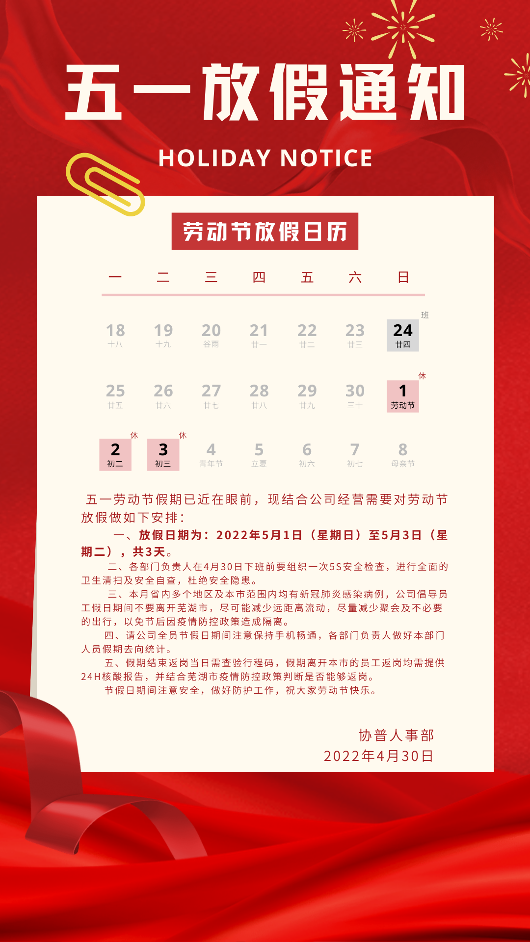 同時(shí),也希望大家在享受“五一”假期的同時(shí),做好個(gè)人防護(hù),注意自身安全,過一個(gè)平安的勞動節(jié)!