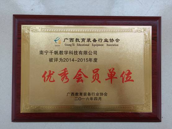熱烈慶祝南寧千帆獲得由廣西教育裝備行業(yè)協(xié)會辦頒發(fā)的2014-2015年度“廣西教育裝備行業(yè)協(xié)會優(yōu)秀會員單位”證書。這是廣西教育裝備同行給予我們的肯定。榮譽激勵著千帆人再接再勵,爭取為教育事業(yè)作出更多貢獻。