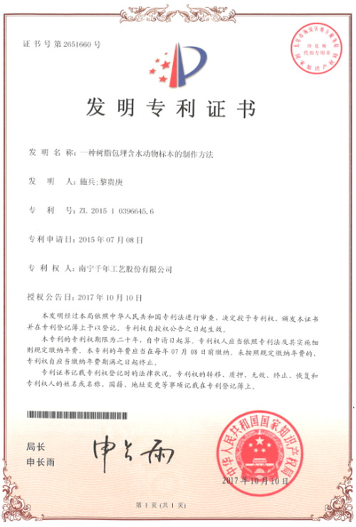 《一種樹脂包埋含水動物標(biāo)本的制作方法》該發(fā)明提供了一種樹脂包埋含水動物標(biāo)本的制作方法。千年工藝生產(chǎn)的“千帆”品牌包埋標(biāo)本采用該發(fā)明的技術(shù)方案,使得包埋在樹脂中的標(biāo)本形態(tài)顏色逼真,標(biāo)本表面沒有起霧等質(zhì)量問題;包埋樹脂沒有起霧,渾濁現(xiàn)象;樹脂透明度高,能夠清晰觀察到標(biāo)本各個細(xì)節(jié);長時間使用,樹脂不變黃,標(biāo)本不腐敗。