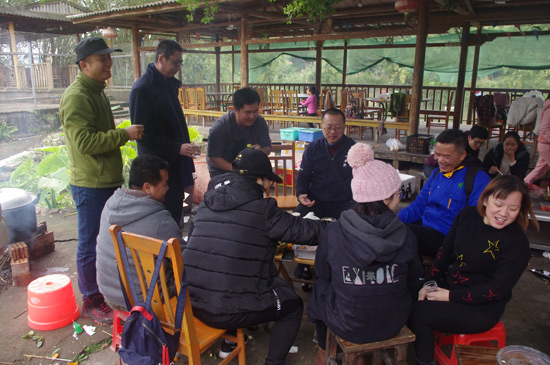 10:30分,我們正式抵達(dá)目的地“竹泉島山莊”,大家紛紛參與到午餐的準(zhǔn)備活動中,生火、穿菜、刷油、配料、烤串……,大家紛紛施展各自拿手絕活,忙得不亦樂乎,不一會大家親手烤制的肉串就飄出陣陣誘人的香氣。太陽很應(yīng)景在此刻從云層中鉆出,金色的光芒透過樹蔭照在每個朝氣蓬勃的笑臉上。